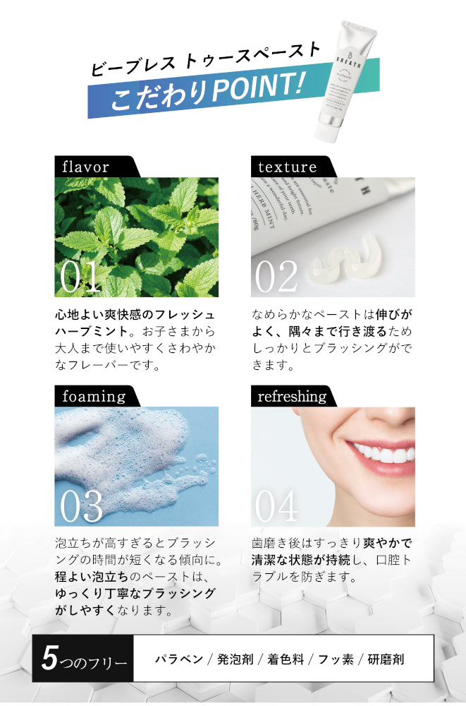 他の有効成分との相乗効果も確認されており、口腔向け製剤の機能性の向上が期待できる成分です。口腔細菌付着抑制作用・口臭成分抑制作用・着色抑制作用があります。